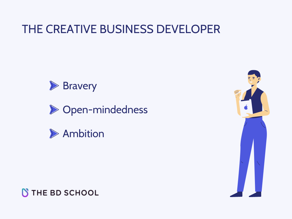 In general, creative business developers are first and foremost brave. They aren’t afraid of failing or getting out of their comfort zone. They’re focused and have a set of targets they want to accomplish. Importantly, they know that sometimes the best-known strategies won’t work. So, they’re ready to push their boundaries and think imaginatively to come up with solutions that help them achieve their goals.